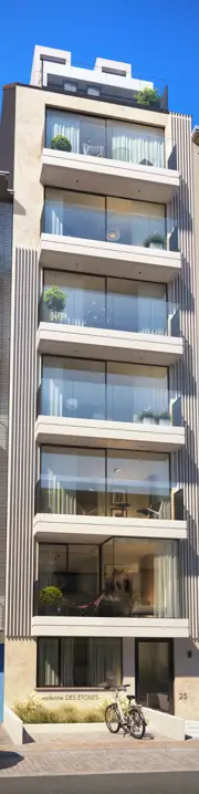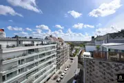 Dans une rue calme de l’Albertplage, à seulement 50 m de la mer et de la plage, se trouve ce superbe penthouse dans la nouvelle résidence Des Étoiles. Un emplacement à valeur durable grâce à la requalification du quartier du Casino et au futur parc paysager.Au septième étage : hall d’entrée avec vestiaire et toilettes invités, vaste séjour avec vue latérale sur la mer et accès à la terrasse ensoleillée. La cuisine ouverte, entièrement équipée avec coin repas, donne sur la terrasse arrière. Les deux terrasses sont finies avec un platelage en bois. Buanderie pratique avec raccordement pour machine à laver et volets roulants sur la façade arrière.Au huitième étage : deux chambres confortables, chacune pouvant accueillir un lit double, et une élégante salle de douche réalisée en Aqua Sensa (finitions mortex).Le penthouse se distingue par sa hauteur sous plafond de 2,60 m, son chauffage par le sol sur géothermie (chauffage et rafraîchissement), et son parquet en pointe de Hongrie dans tout l’appartement, sauf dans la cuisine, le WC invités, les pièces d’eau et la chambre principale. Toutes les portes intérieures sont des portes affleurantes de type Xinix. Une cave avec crochets à vélos est prévue dans l’immeuble.